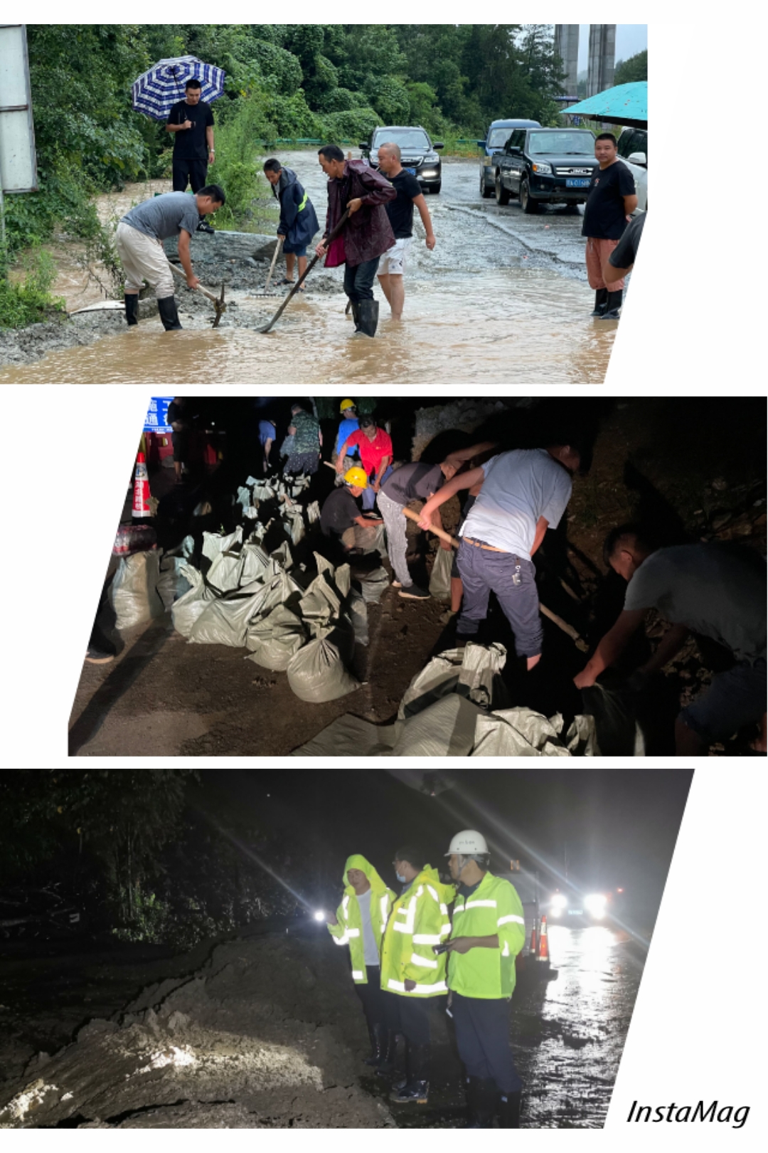 十淅2标项目降雨前深入现场针对排水系统、高边坡稳定性等开展防汛隐患排查,配合政府相关部门对可能发生重大险情的地段进行三次摸查,重点加强了三清庙大桥、E匝道桥、路基六队等汛情多发地的监控。暴雨来临后,十淅项目与时间赛跑,组织工人上足机械设备,建立沙坝防汛抢险,一周内抢通村道十余公里,与地方村委会一同转移受灾群众十余户,争取将当地损失降到最低。