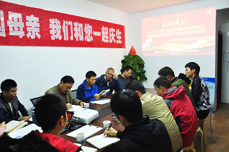 10月19日,为坚持全面从严治党,杜绝贪腐现象的滋生,湖北路桥郧西PPP项目积极响应乐动手机网页版登录入口-乐动(中国) 公司党委的廉政号召,组织开展了2018年10月党风廉政建设专题会议暨纪检监察宣传教育“十进十建”系列活动。