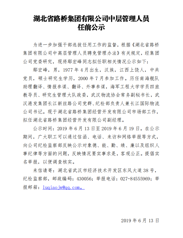 湖北路桥2018年关于拟转聘人员的公示