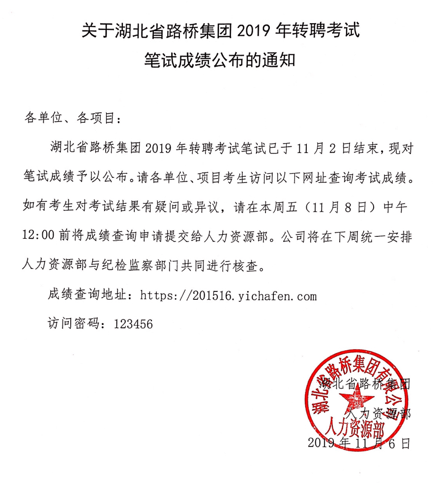 关于湖北省路桥乐动手机网页版登录入口-乐动(中国) 2019年转聘考试笔试成绩公布的通知