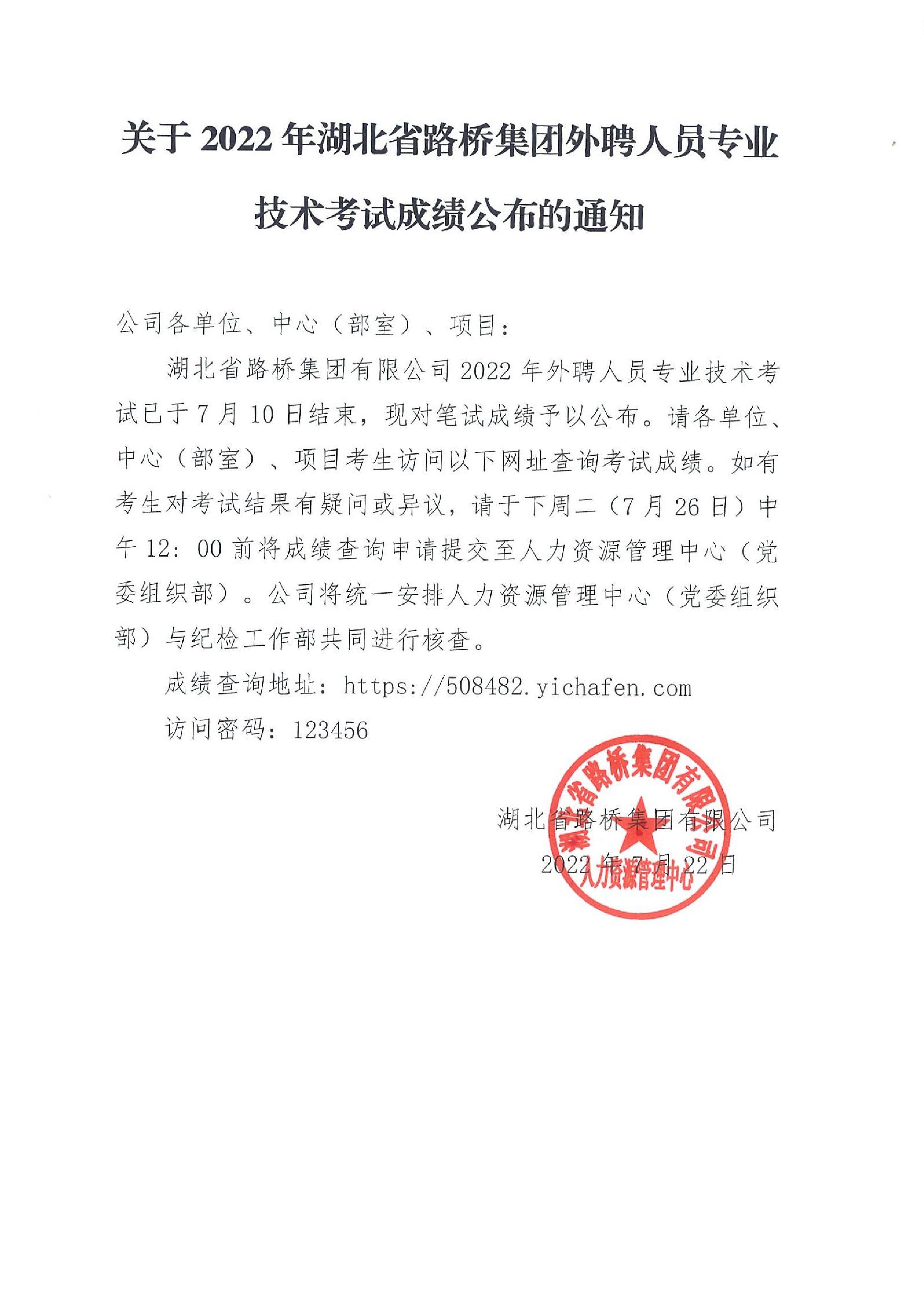 关于2022年湖北省路桥乐动手机网页版登录入口-乐动(中国) 外聘人员专业技术考试成绩公布的通知