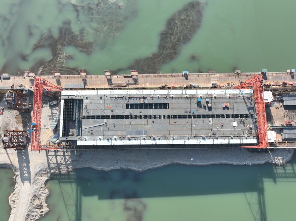 依托丹江口市水都二桥工程,通过“板凳+局部锚固”钢管桩抗高流速水情施工技术、钢管桩沉桩无引孔技术及钢栈桥快速装配施工技术等关键技术,顺利完成了钢栈桥施工。通过钢管桩直接振动沉桩形成“板凳桩”,提高了栈桥横向稳定性,同时直接振打钢管桩沉桩,管内无需浇筑砼,提高了施工效率,降低了施工成本,此外,依次装配安装钢栈桥各类装配构件以及装配式定位导向架,减少了大量现场焊接工作,加快了施工速度,具有较好的推广应用前景。