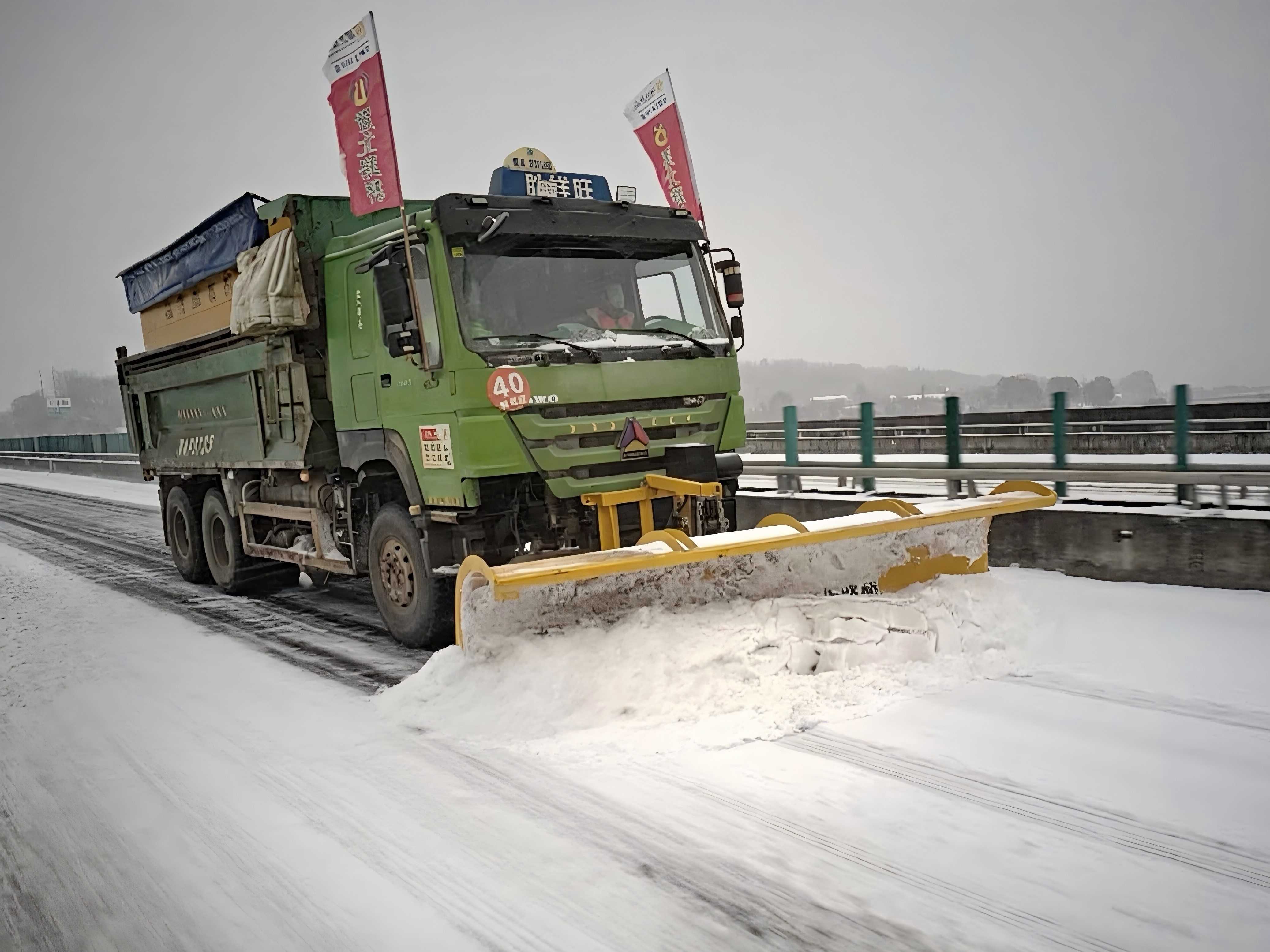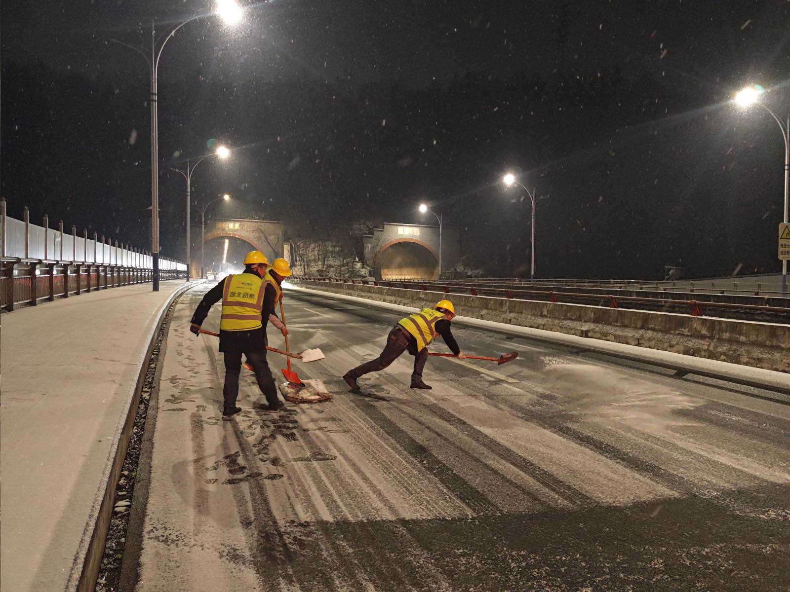 风雪骤至,战鼓催征。19日晚,降雪如期而至且强度持续升级,路面被积雪覆盖,冰层快速凝结。项目应急攻坚队即刻集结,60余名养护人员身着“高速橙”,驾驶16台铲雪设备、10台撒布机火速奔赴各责任路段。现场采取“机械为主、人工为辅”的科学作业模式,构建“前铲后撒、循环推进、全域覆盖”的梯队作战体系;铲雪车轰鸣开路,铁铲破冰扫雪,在风雪中开辟出畅通通道;撒布车紧随其后,精准播撒融雪剂,加速冰层消融,不留一处死角、不存一处隐患。项目实行领导带班制和24小时值守制,党员干部冲锋在前、靠前指挥,实时研判路况、科学调度力量,用身影诠释担当,用行动凝聚斗志。寒夜中,凛冽的寒风裹挟着雪粒,拍打在养护人员的脸上,他们却无暇顾及湿透的衣物、冻僵的双手,始终坚守作业一线。截至目前,项目累计完成除雪里程64.4公里,消耗融雪剂100余吨,有效保障高速路通行安全。
