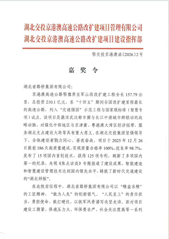 京港澳改扩建项目指挥部对湖北路桥京港澳改扩建1标项目建设中做出的突出贡献予以通令嘉奖。该项目是“十四五”期间全国改扩建里程最长的“交通强国”示范工程,对激活武汉都市圈与长江中游城市群联动的战略动脉,对强化中部地区与京津冀、粤港澳大湾区经济纽带,服务湖北支点建设具有重大意义。项目建设期间,湖北路桥圆满出色完成建设任务,成功铸就新时代交通建设“湖北样板”。