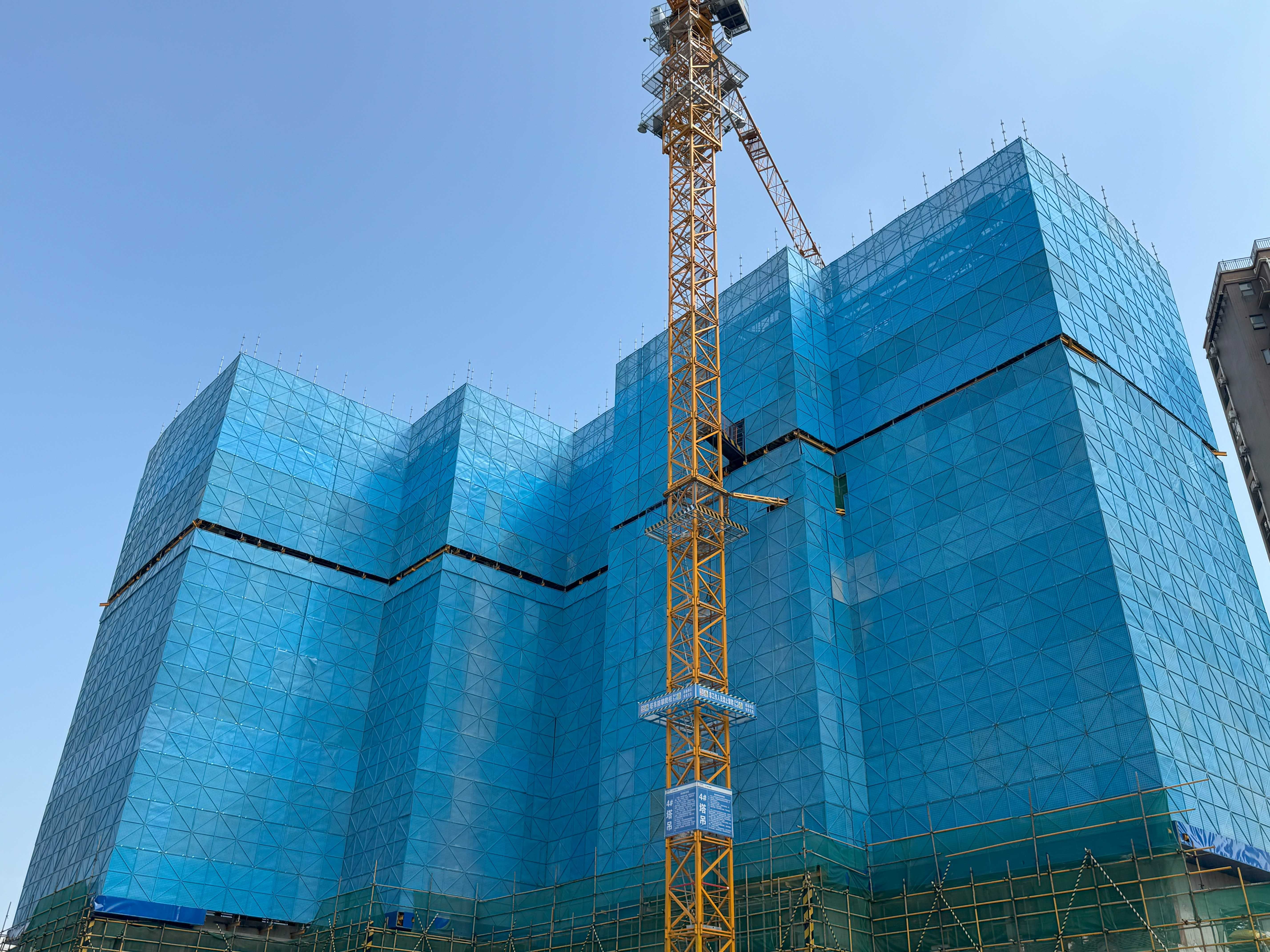 走进施工现场,极目新闻记者看到,在建的5栋高层建筑外立面上采用蓝色的花篮悬挑脚手架,既美观又安全。