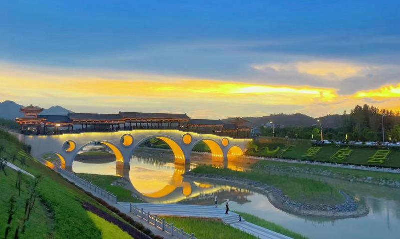 西河拱桥位于老西河拱桥北面,全长106m,采用27+37+27m上承式钢筋混凝土拱桥结构,桥拱采用古风古韵的风雨廊桥造型,与房县《诗经》文化遥相呼应。